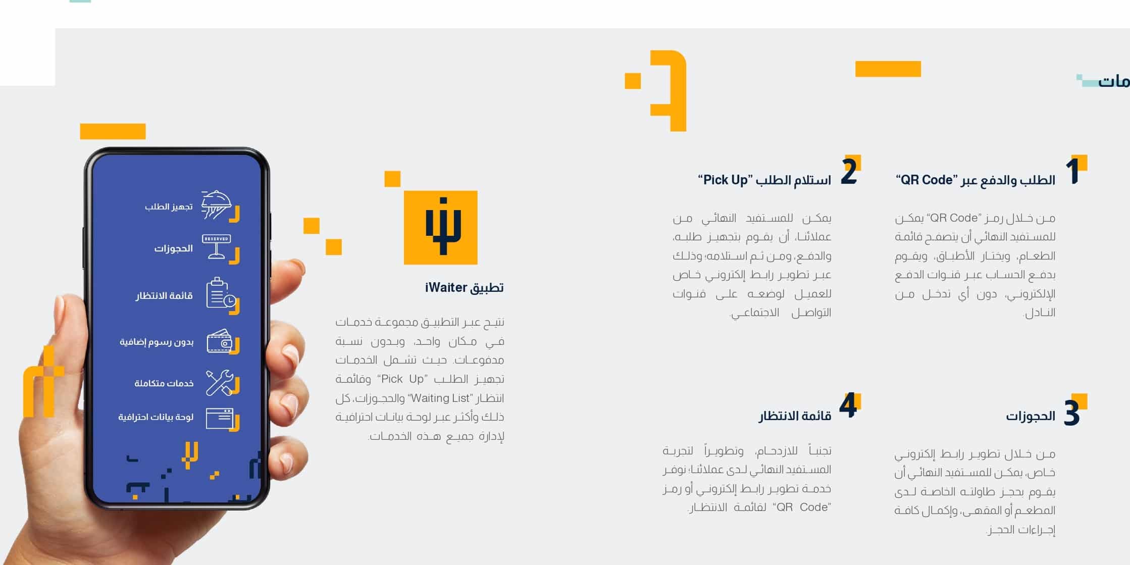 - يدعم موقع آي ويتر المخصص تلقي طلبات الاستلام وحجز الطاولات وإدارة قوائم الانتظار، مما يمنح المطاعم مرونة في إدارة الخدمة.