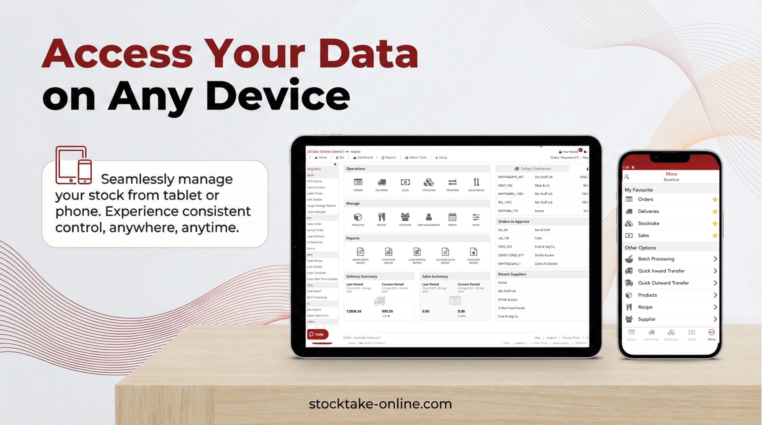 ستوك تيك أونلاين (StockTake Online) هو منصة متكاملة للتحكم في المخزون وإدارة المستودعات مصممة خصيصًا للمطاعم، المقاهي، المخابز، مطاعم الخدمة السريعة، والمطابخ السحابية. من خلال تبسيط عمليات الشراء، حساب تكلفة الوصفات، إدارة الموردين، والتقارير، تمكّن STO منشآت الضيافة من تقليل الهدر، تحسين اتخاذ القرار، وزيادة الربحية.