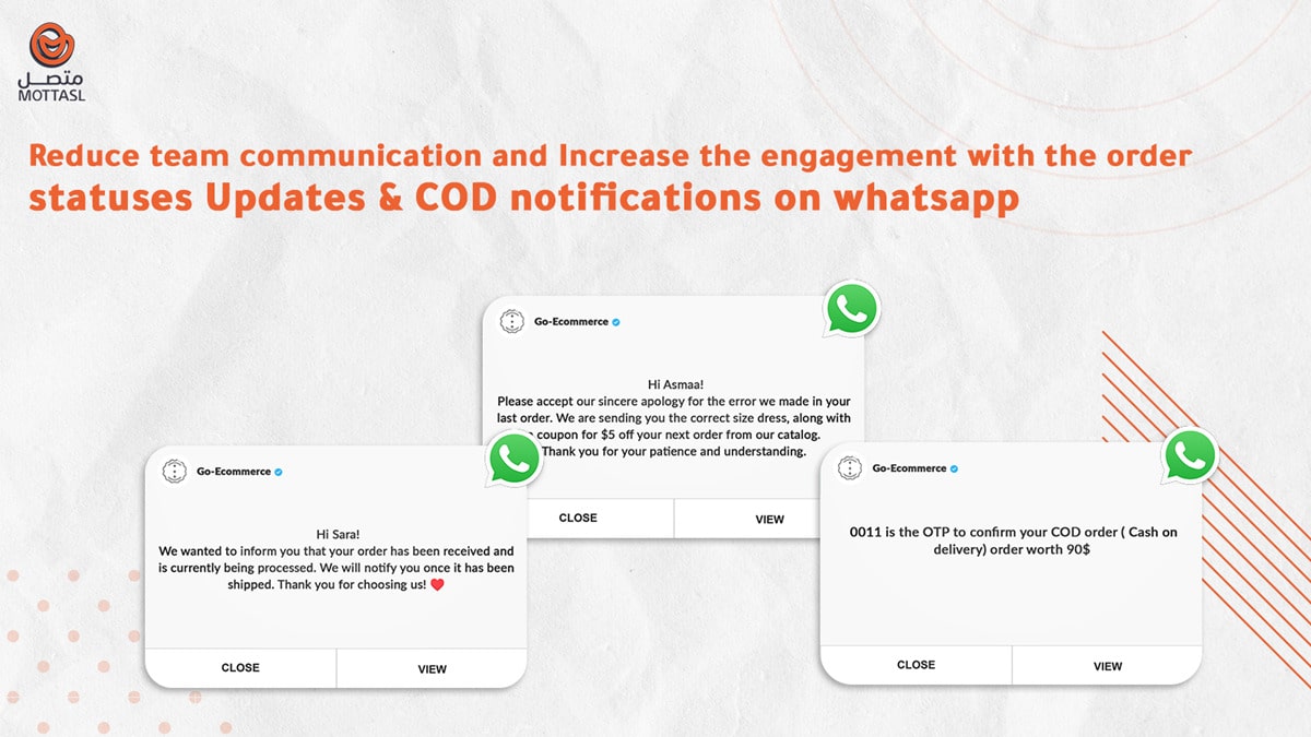 سيساعدك تطبيق متصل في ربط متجرك حتى يتمكن عملاؤك من تلقي تحديثات حالة الطلب وإعلانات الحملة الترويجية عبر الواتساب.