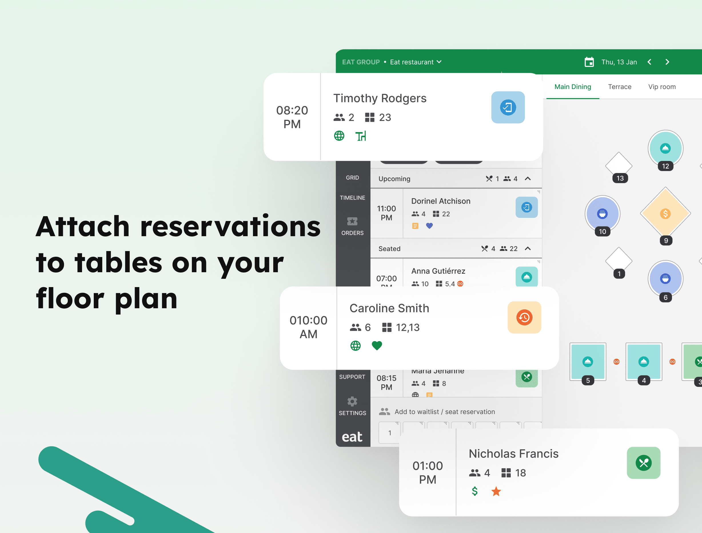 يساعد تطبيق Eat مطاعم الضيافة في الحصول على المزيد من الحجوزات عبر الإنترنت ويجمع بيانات الضيوف بما يجعل طاقم المطعم على اطلاع كامل بجميع البيانات التي يحتاجونها لتقديم أفضل تجارب للعملاء. أنشئ تجربة حجز سلسة ووفر ساعات من الوقت في إدارة الحجوزات. عند الربط مع فودكس، ستستفيد من بيانات إنفاق الضيف في الزمن الحقيقي في نظام إدارة الطاولات الخاص بك.