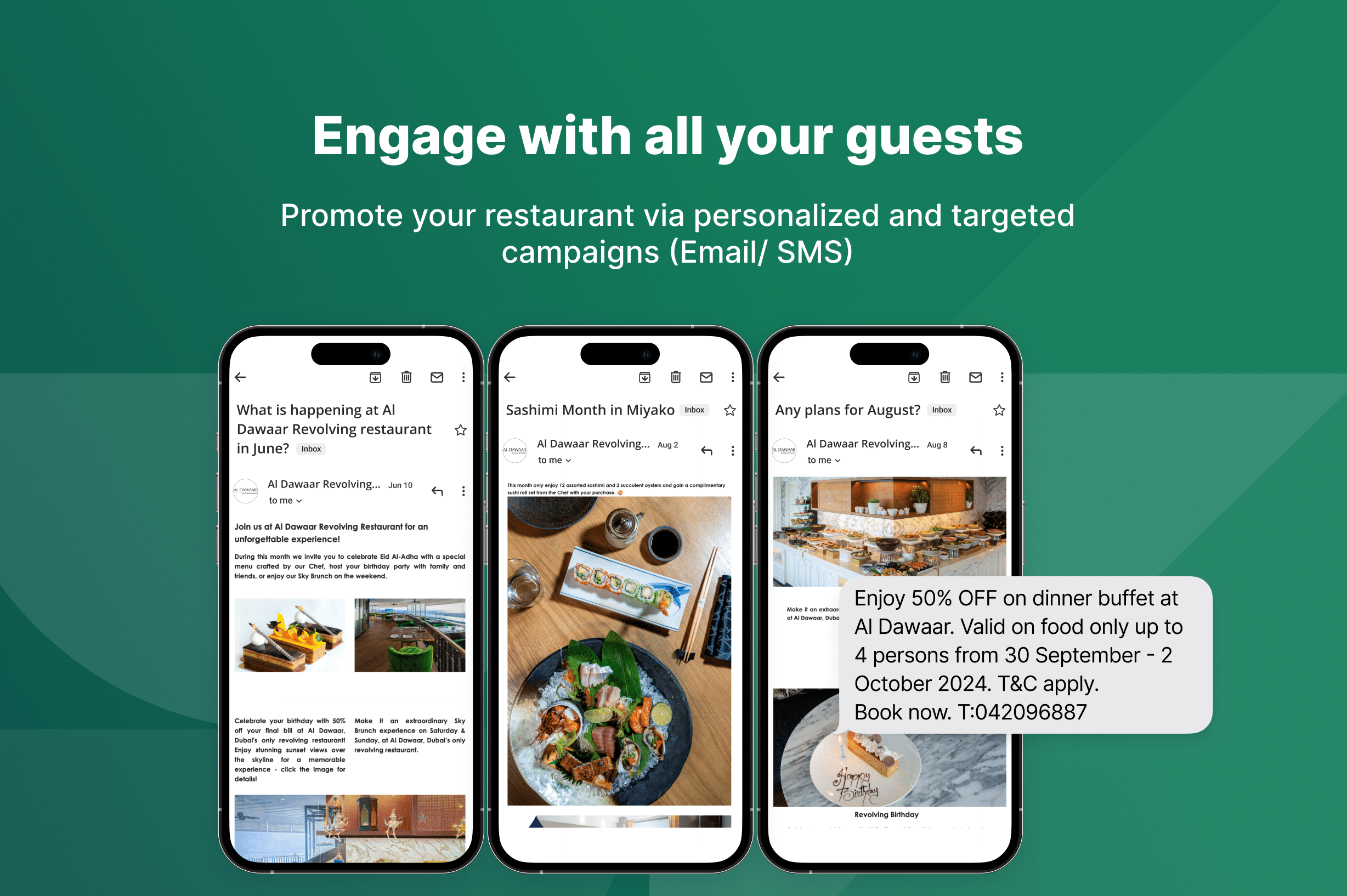 - إرسال رسائل تسويقية مستهدفة: قم بإعادة التفاعل مع الضيوف عبر رسائل بريد إلكتروني والرسائل القصيرة (باللغتين العربية والإنجليزية) باستخدام قوالب جاهزة لترويج العروض والتحديثات.