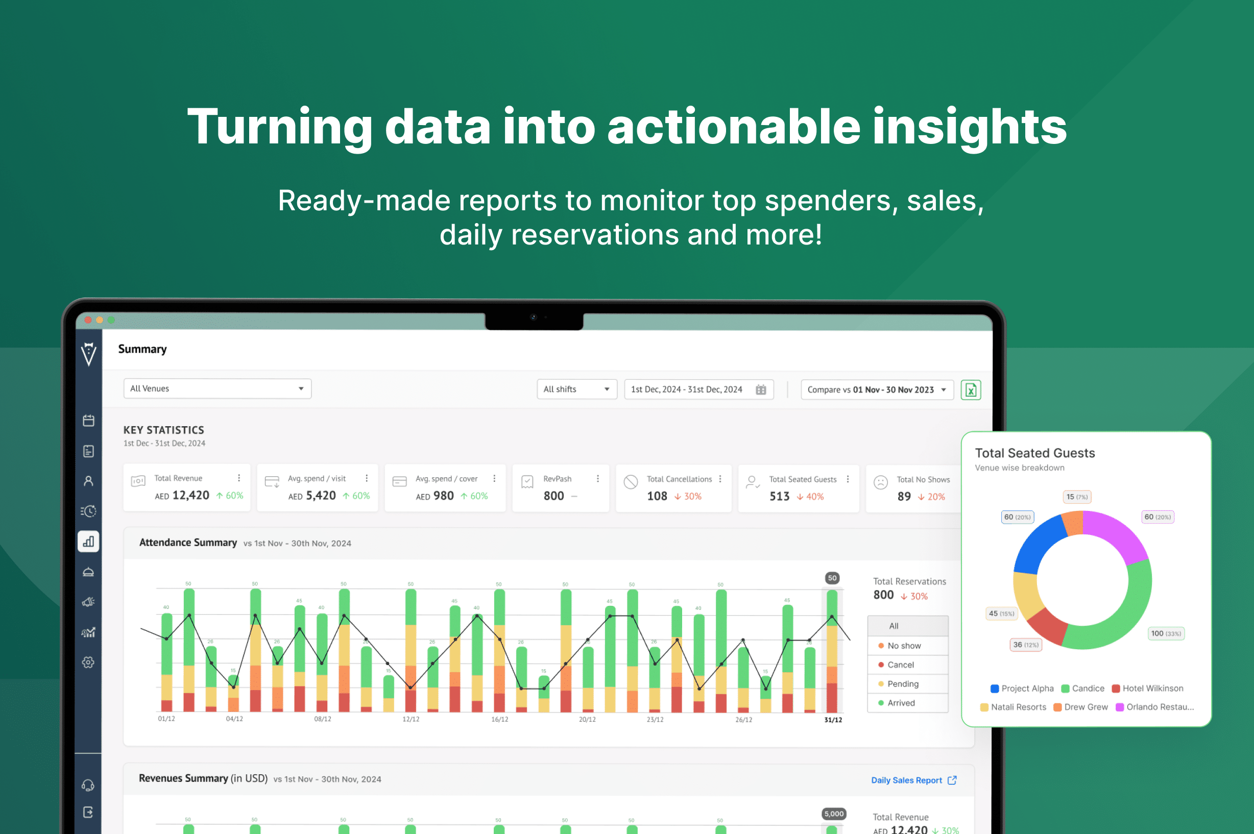 - نظام حجز قوي: يقدم تجربة مستخدم مميزة تمكّنك من إنشاء علامات مخصصة للطاولات، إعداد تركيبات الطاولات، وفهم سعة الحجوزات عبر الإنترنت واليدوية لتحسين دوران الطاولات بتحديثات في الوقت الفعلي.