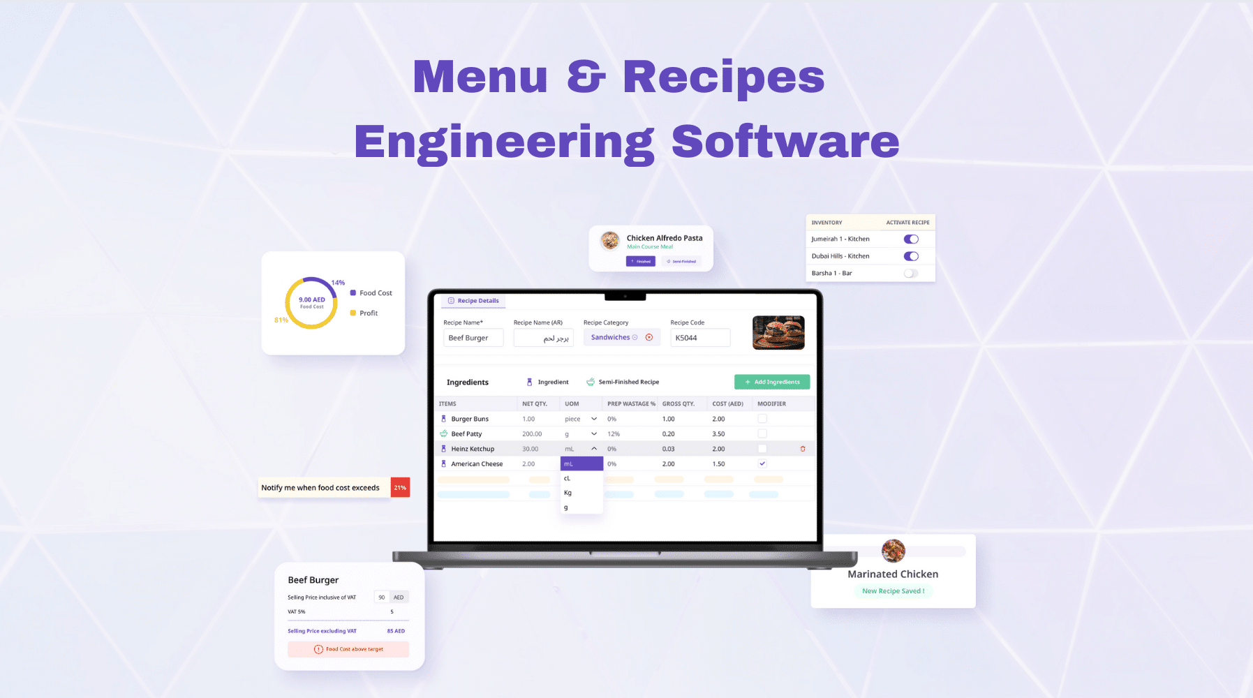 هندسة المنبو والوصفات: أدخل العناصر والكميات الدقيقة لتكرار الوصفات بسهولة، واربط سعر المكونات في الزمن الحقيقي بالوصفات لتجنب الوقوع في فخ بيعها بخسارة، واعثر على السعر المناسب لك ولعملائك من خلال أداة محاكاة التكلفة التي نوفرها.