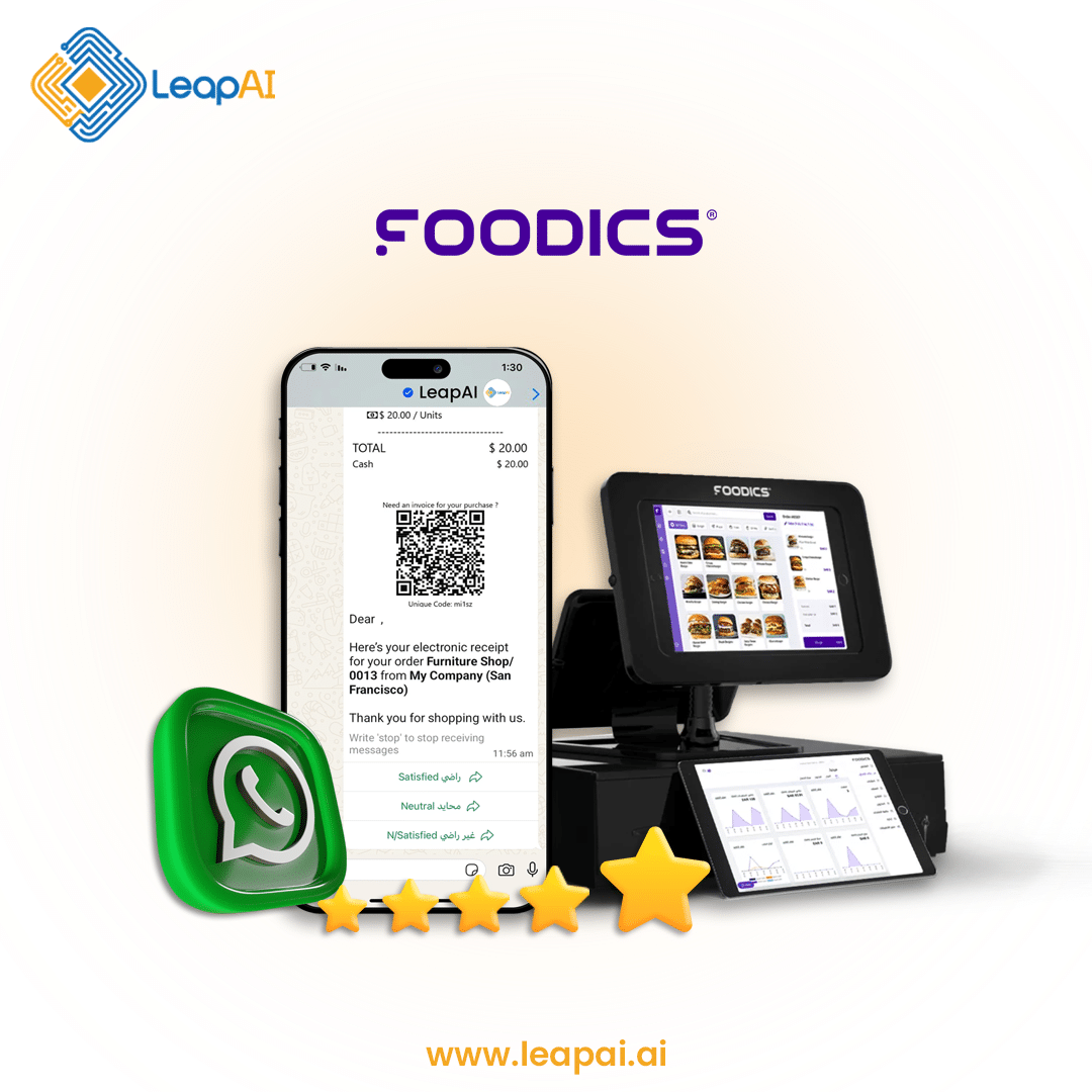 تساعد ليب أيه آي منشآت فودكس على التواصل الفوري مع العملاء عبر واتساب بعد كل عملية بيع. من خلال أتمتة التواصل بعد الشراء، تتمكن المطاعم من إرسال الفواتير وبناء الثقة والحضور المستمر على القناة المفضلة للعملاء.